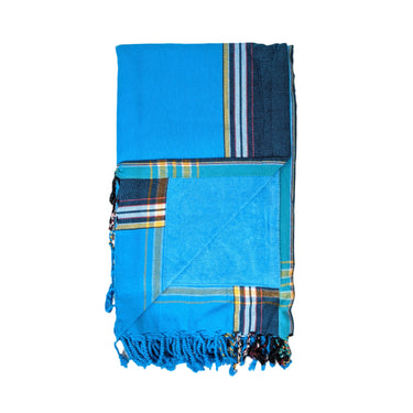 Soak up some sun with the Medium Blue Kenyan Beach Towel! Our fair trade Kenyan Beach Towels are ethically crafted in Nairobi, Kenya. We back lightweight and absorbent hand-loomed cotton kikoy cloth with quick-dry microfiber terry for extra absorption. The hidden velcro pocket in the interior is perfect for storing your keys or phone!