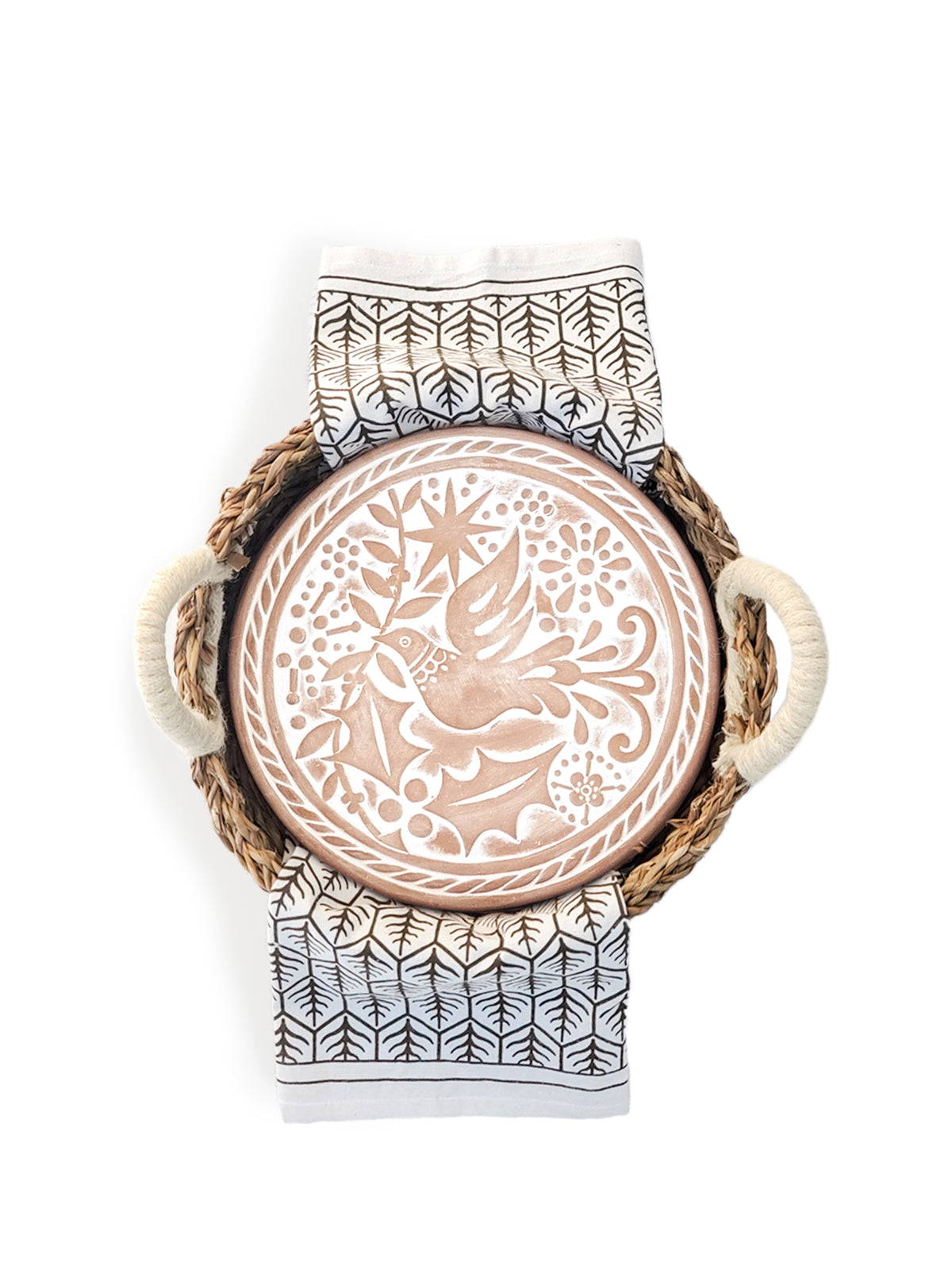 Add a bit of artisan-inspired style to the kitchen with a terracotta bread warmer and hand screen printed tea towel. Engraved with a bird design and cut to fit neatly into a round basket, this terracotta special bread warmer is naturally insulating, and the basket itself has been handwoven from sustainably grown seagrass. The tea towel is great for drying dishes or hands in the kitchen, lining a bread basket. They are the best gift items for anyone who loves bread!