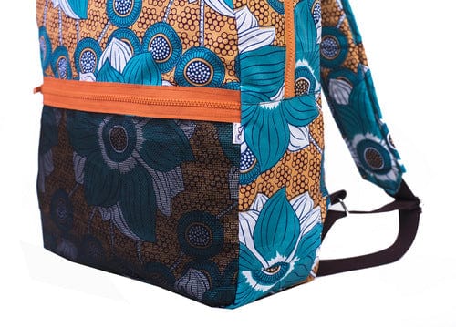 Bloom Backpack, printed in vibrant African print. this backpack is a lightweight cotton piece, finished with net in the front with vibrant neon zips for extra compartments. It also has a generously sized interior - perfect for everything, laptops and books. The adjustable straps are cushioned to ensure comfort.