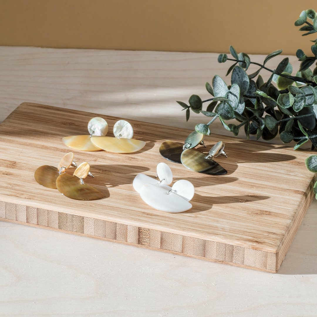 Handcarved, cut, and polished by master artisans, these modern geometric mother of pearl drop earrings add the perfect accent to any outfit. Due to the material and production process, slight variations in color, pattern, or texture may occur naturally. We invite you to embrace their uniqueness and imperfections.