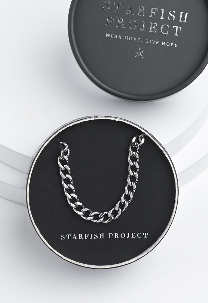 Starfish Project's Linked Curb Chain is a classic made for every day and everyone. Style it solo or double up, either way, it's a strong impact maker. The sleek stainless steel links represent the strength of people like you and me, joining together to hope and fight for a better future for every woman. The 6mm Linked Curb chain featuring Starfish Project's signature starfish icon hinge closure will complete any look—minimal effort with maximum impact! Sweat, Water & Heat Proof No Green Skin – Hypoallergenic Impactful – Survivors of human trafficking build sustainable lives of freedom by creating your jewelry!