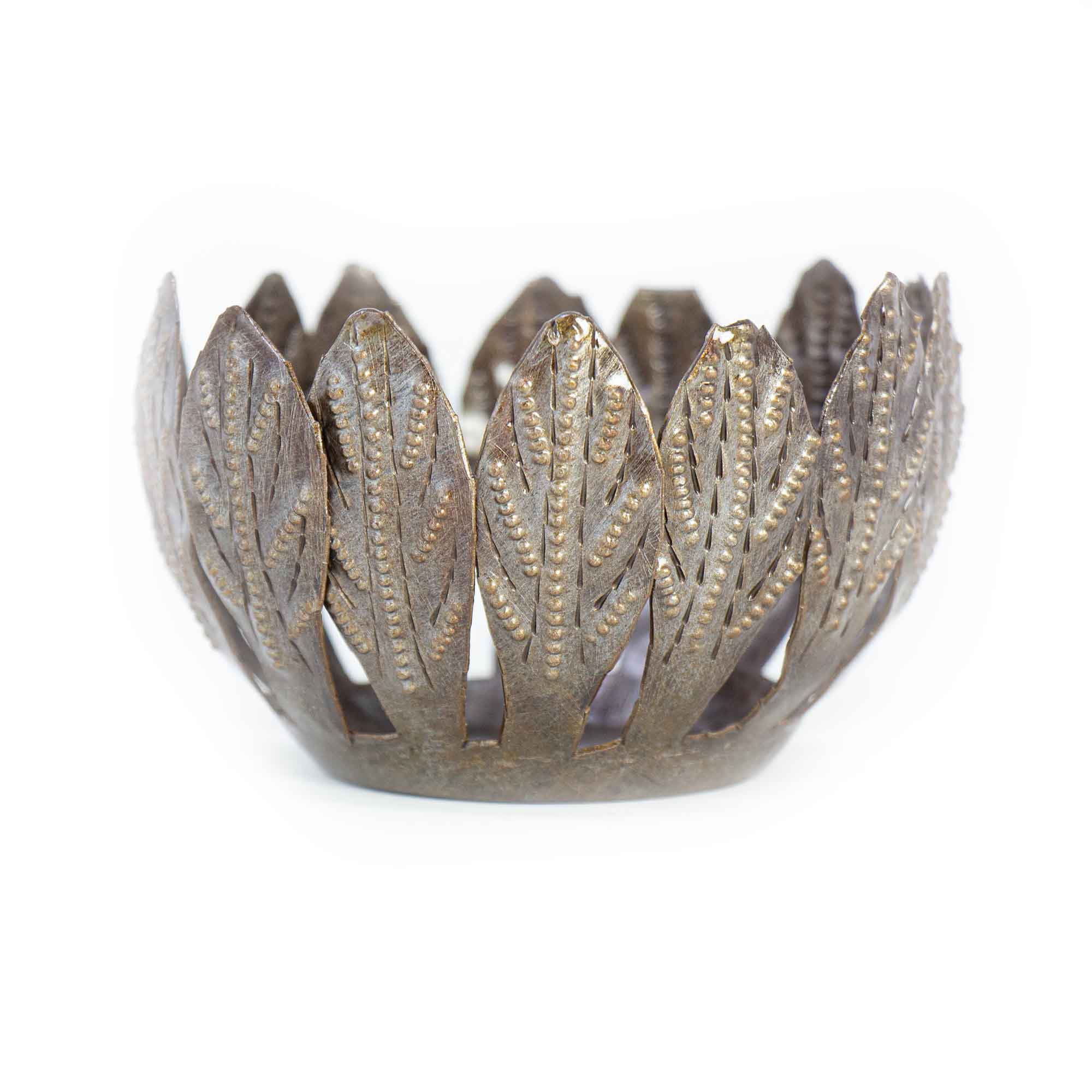 This intricate bowl or votive holder depicts the leaves from the trees found in Haiti. Local artists are inspired by the nature around them as they form the art pieces from upcycled steel oil drum. A lovely addition to any table or nook in the home. Suitable for Indoor or Outdoor Use.