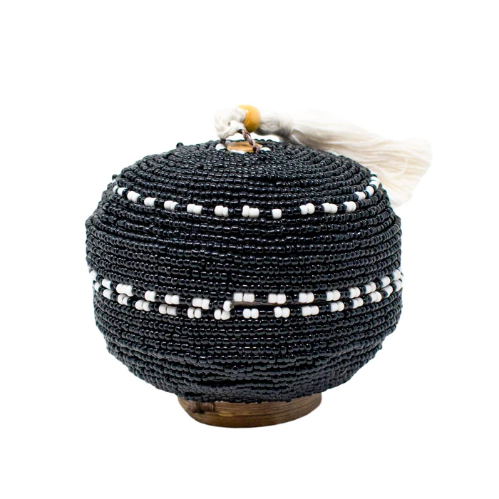 A beautiful hand-beaded small bowl with a lid and fun tassel feature!