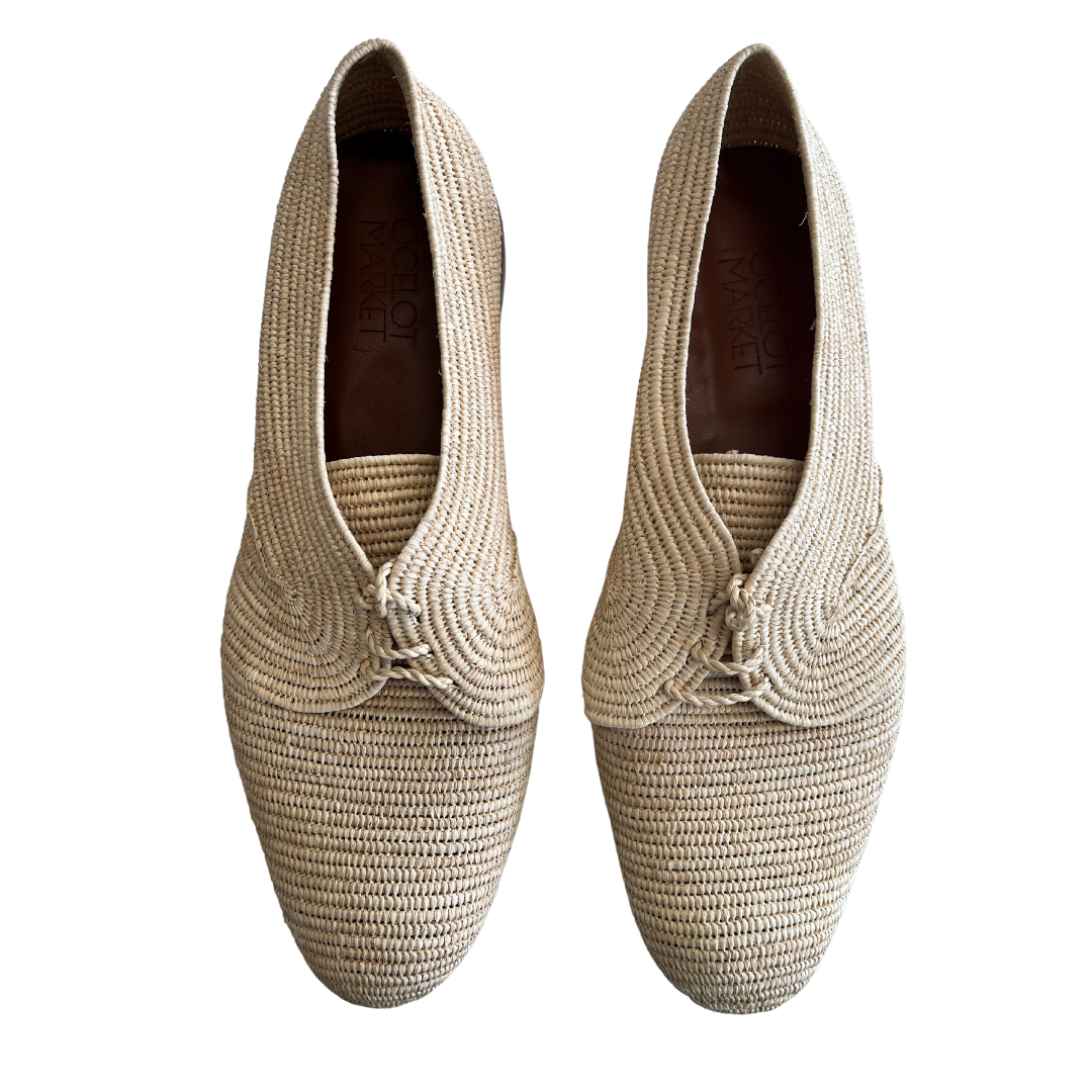 - Handmade woven raffia upper with a hard sole and leather insole.