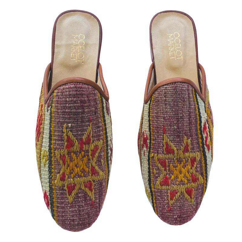 Handmade wool kilim rug upper with a leather sole and leather lining. This style is made from a repurposed 40+ year old Turkish kilim rug and each design is one-of-a-kind.