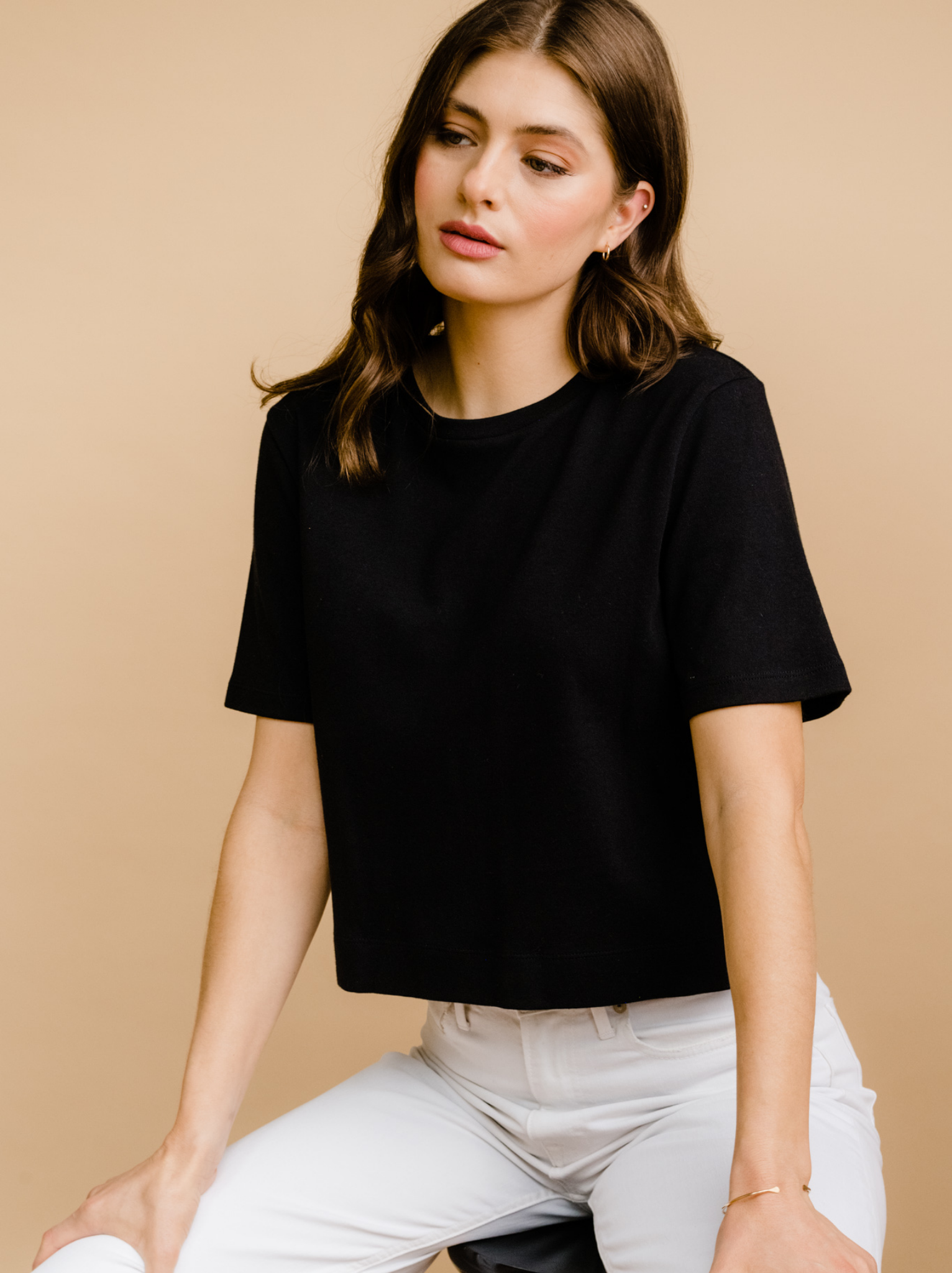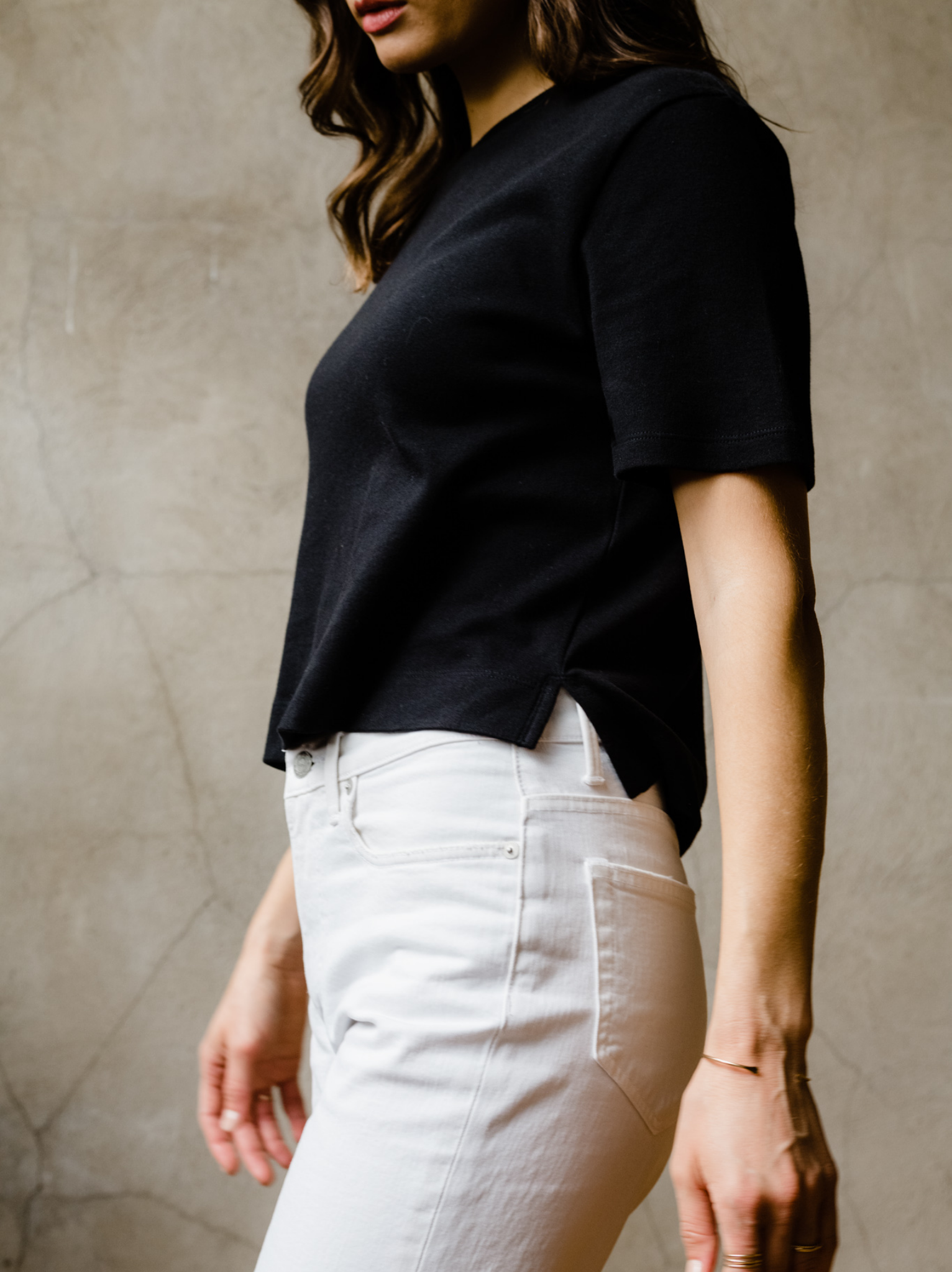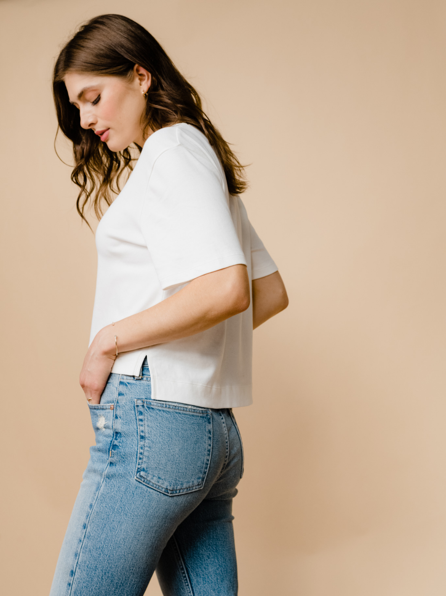 This short sleeve crew neck is boxy yet flattering thanks to its slight crop. Maria is made from 100% organic cotton with a structured fit. Pair with high waisted bottoms for the perfect balanced outfit.