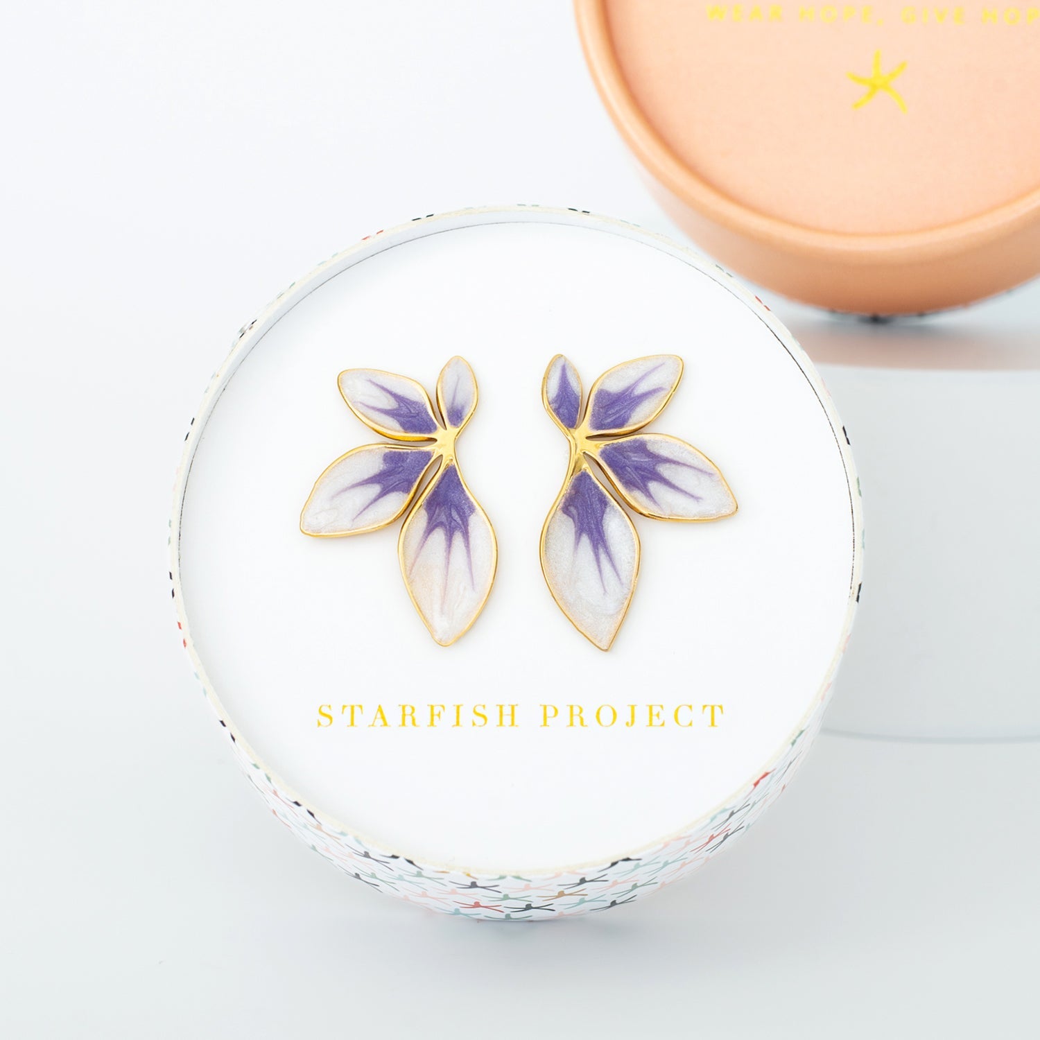 A celebration of beauty and transformation, the Flourish Earrings feature modern, geometric petals painted in glittering lavender enamel and framed in radiant 14K gold plating. Their artful design brings a fresh, elegant touch to any look—wear them with a flowing dress for effortless grace or let them add a pop of color to your everyday style.