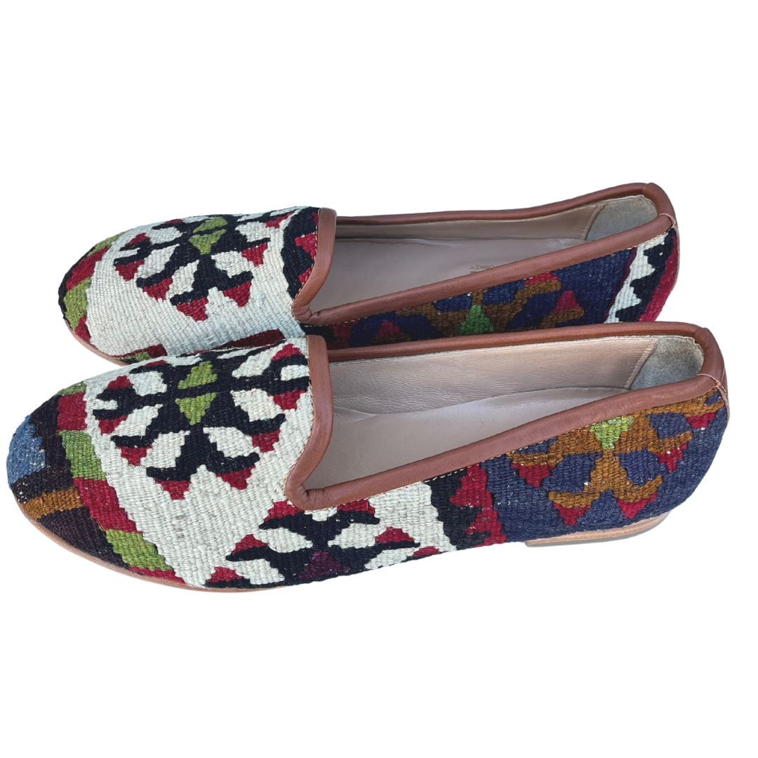 Handmade wool kilim rug upper with a leather sole and leather lining. This style is made from a repurposed 40+ year old Turkish kilim rug and each design is one-of-a-kind.