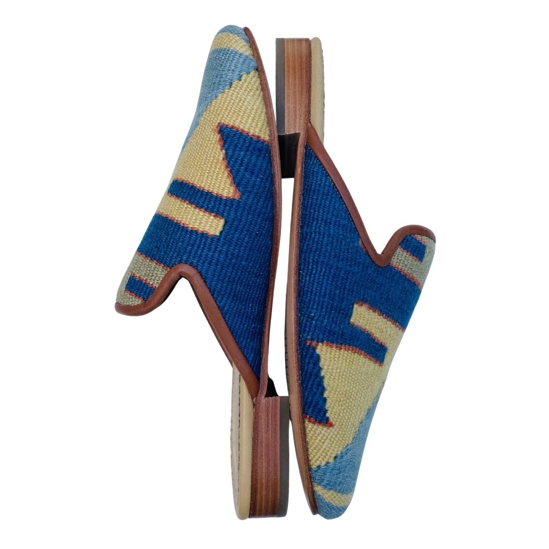 Handmade wool kilim rug upper with a leather sole and leather lining. This style is made from a repurposed 40+ year old Turkish kilim rug and each design is one-of-a-kind.