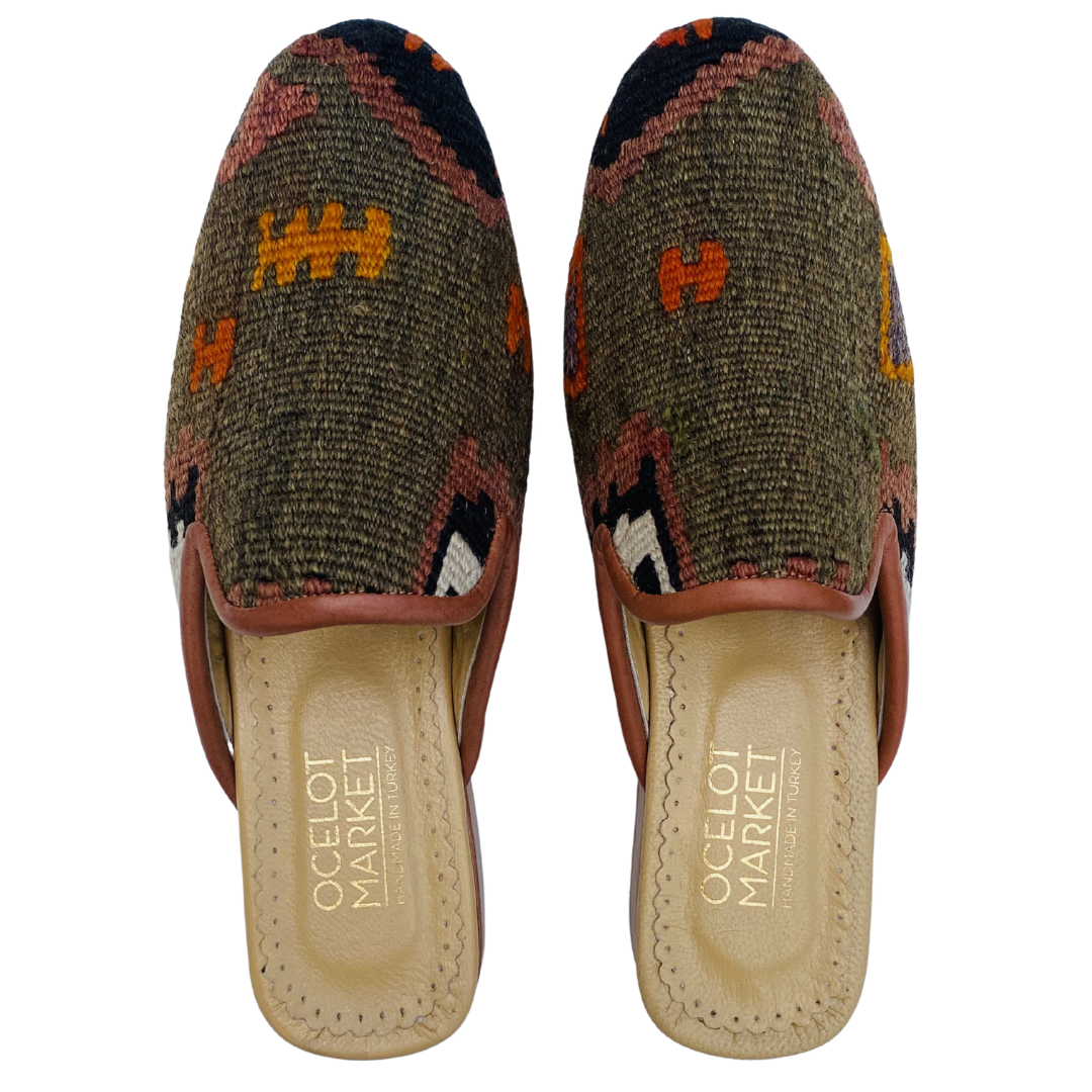 Handmade wool kilim rug upper with a leather sole and leather lining. This style is made from a repurposed 40+ year old Turkish kilim rug and each design is one-of-a-kind.