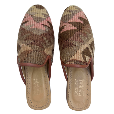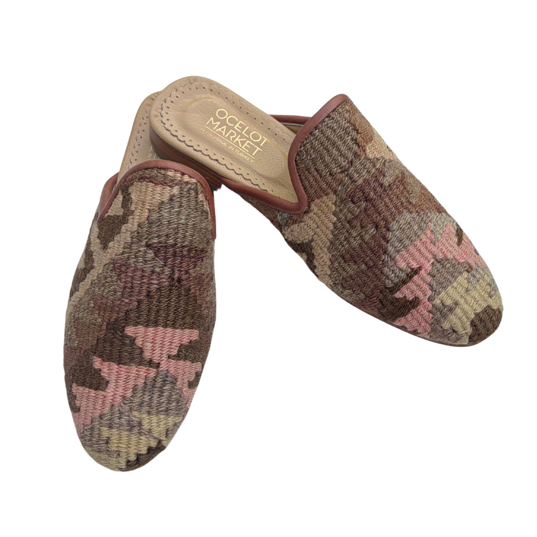 Handmade wool kilim rug upper with a leather sole and leather lining. This style is made from a repurposed 40+ year old Turkish kilim rug and each design is one-of-a-kind.