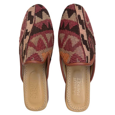 Handmade wool kilim rug upper with a leather sole and leather lining. This style is made from a repurposed 40+ year old Turkish kilim rug and each design is one-of-a-kind.